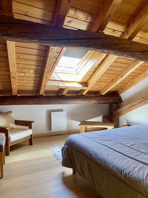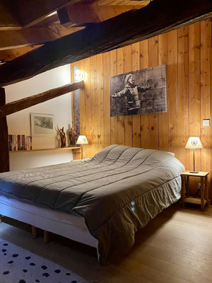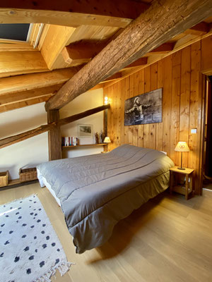 Située au deuxième étage du chalet, cette ravissante chambre se compose d'un double lit et d'une série d'espace de rangement. La salle de bain est au même étage.
